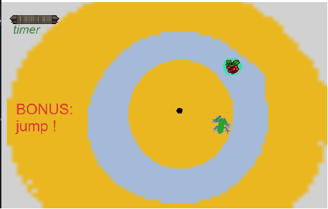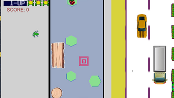 Il classico gioco arcade Frogger: varie scene dove la rana deve prima attraversare un fiume, saltellando sulle piante galleggianti; poi una strada con le auto. Puoi muoverti solo in avanti!